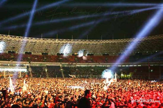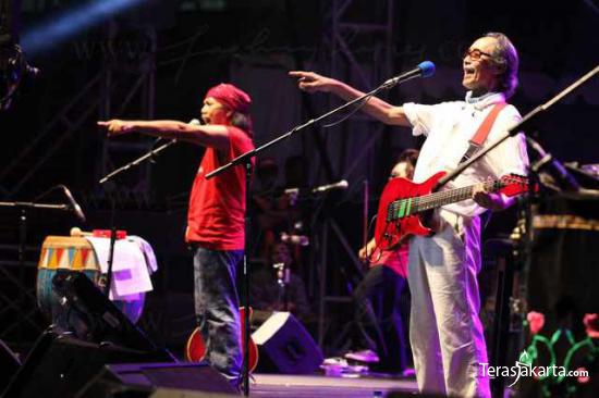 Para macan tua yang digawangi Iwan Fals, Setiawan Djody dan Sawung Jabo di Stadion Gelora Bung Karno, Jakarta, Jumat (30/12) malam. Kantata kembali membawakan lagu-lagu legendarisnya setelah 21 tahun vakum dari dunia musik.